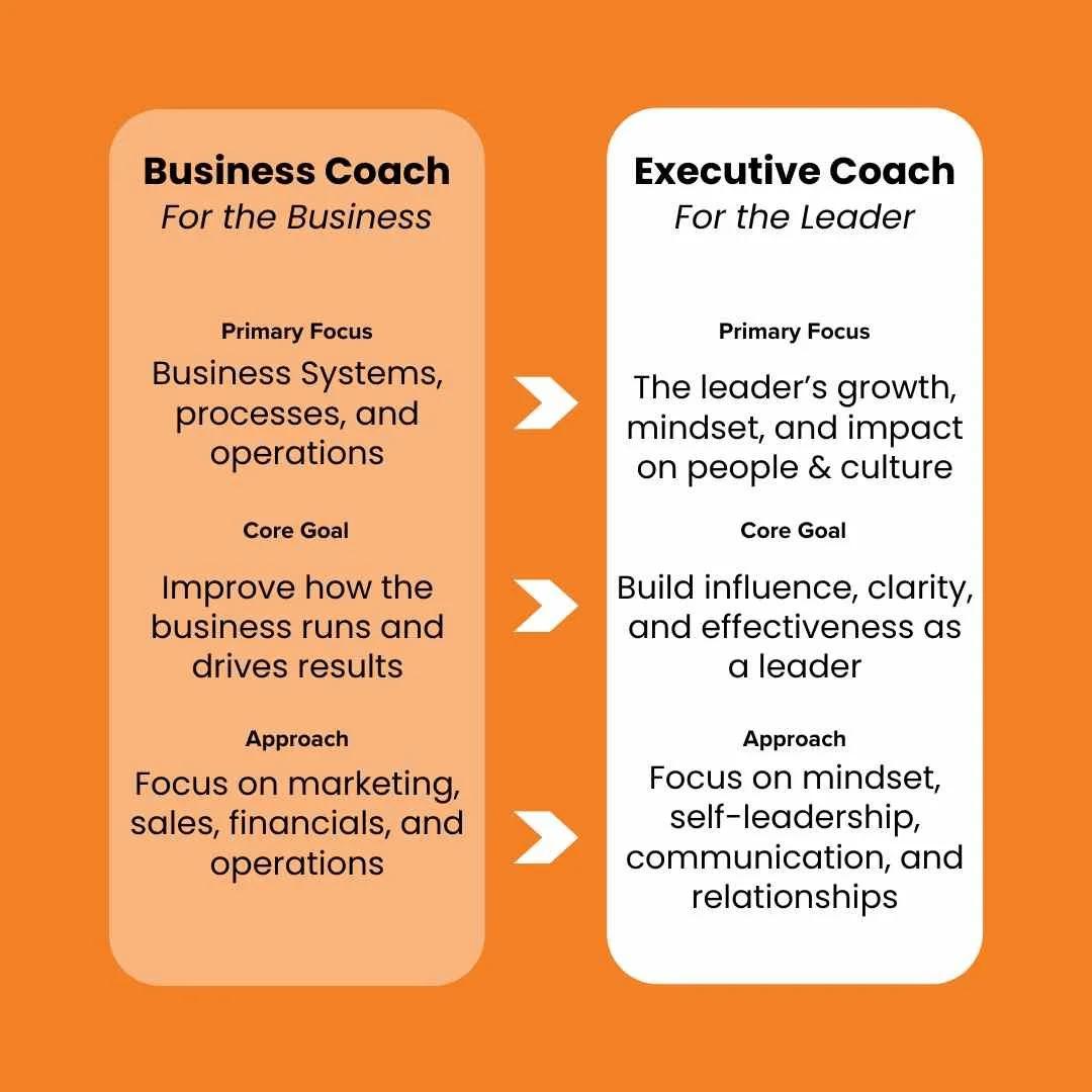 Two situations may look almost identical from the outside: an owner wants to step back from the day-to-day, and a new leader is promoted to take over. In one case, a business coach may be the right fit, helping establish systems, processes, and structure while supporting the leader in managing them. In another, an executive coach may be the better choice, helping the new leader understand themselves and their influence on others. The distinction matters because systems without strong leadership often fail, just as leaders without solid structures in place will struggle to succeed.
